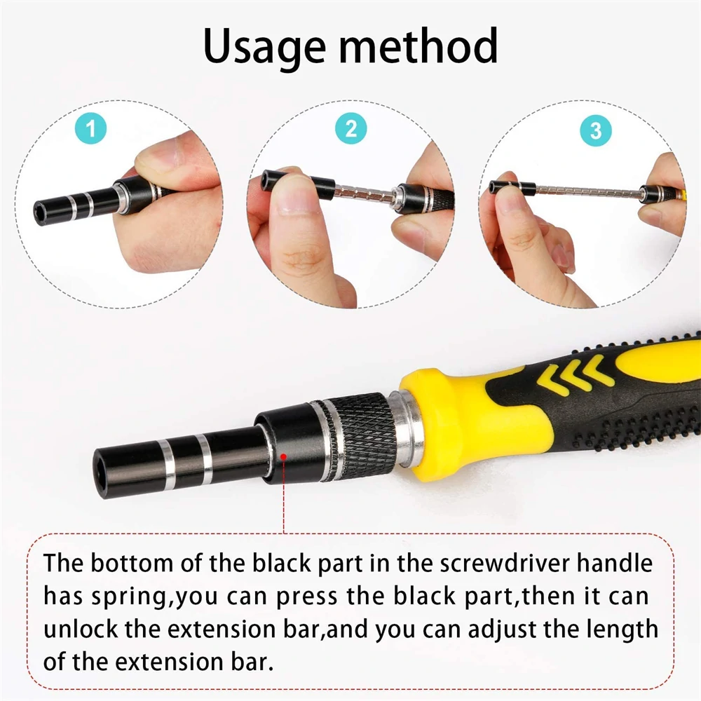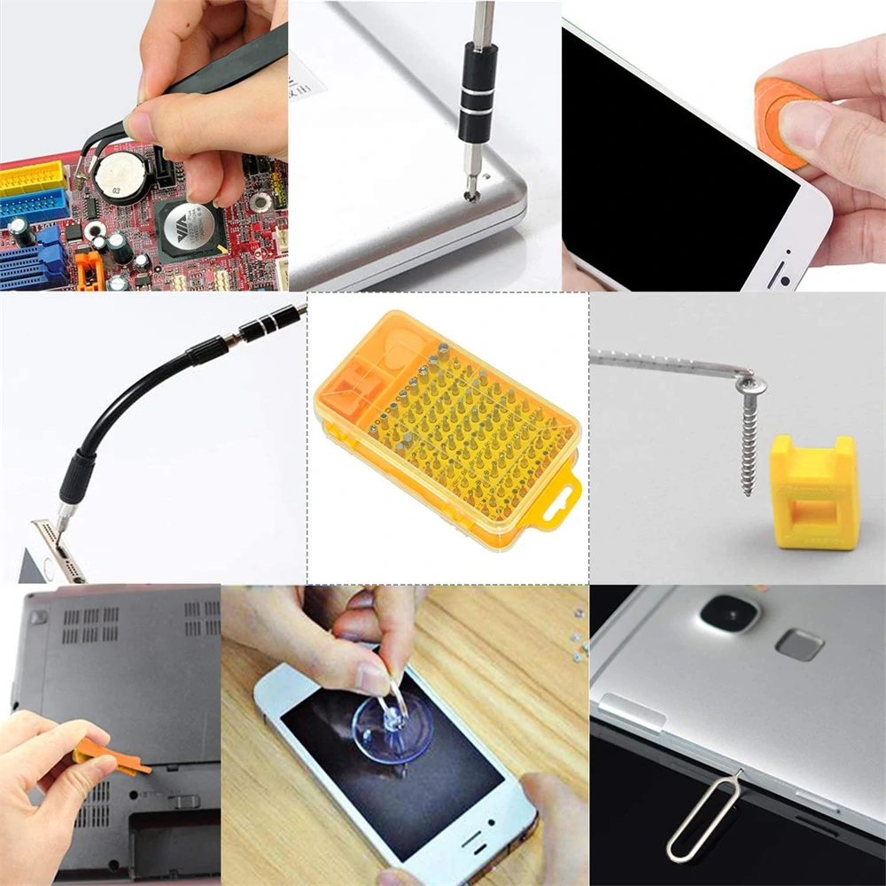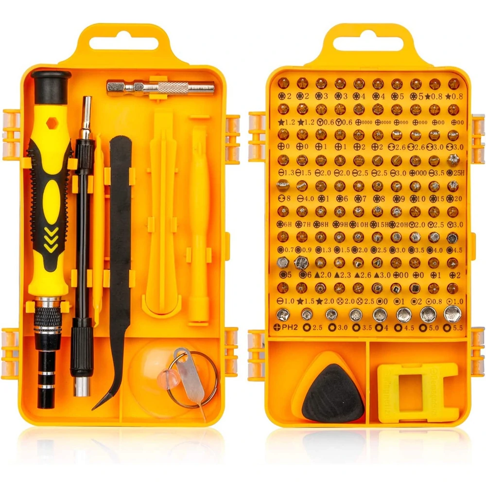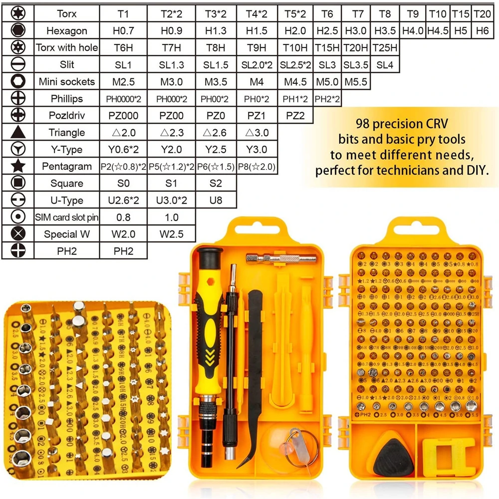 Product name: 115-in-1 Precision Screwdriver Repair Kit Color: Yellow Material: Chrome vanadium alloy steel Rotary head type: Y type, Plum blossom type, Square head, Pozi, Cross, Slotted, Hexagon, Torx Packing size: About 165*110*58mm/6.5*4.3*2.3" Scope of application: Glasses, Watches, Phones, Computers Content: 1 x magnetic handle 1 x extension shaft 1 x short post 1 x aluminum alloy extension shaft 1 x toolbox 1 x tweezers 1 x iIPhone pin 1 x magnetiser/demagnetizer 1 x suction cup 1 x bracts 2 x crowbar 8 x 4mm Mini Sockets: M2.5 · M3 · M3.5 · M4 (2 pieces) · M4.5 · M5 · M5.5 90 x precision bit Slit: 1.0 (2 pieces) · 1.5 (2 pieces) · 2.0 (2 pieces) · 2.5 (2 pieces) · 3.0 (2 pieces) · 3.5 (2 pieces) · 4.0 (2 pieces) Phillips: PH000 (2 pieces) · PH00 (2 pieces) · PH0 (2 pieces) · PH1 (2 pieces) · PH2 (2 pieces) Pozidriv: PZ00 (2 pieces) · PZ0 (2 pieces) · PZ1 (2 pieces) · PZ2 (2 pieces) Torx: T3 (2 pieces) · T4 (2 pieces) · T5-6 (two each) · T7 (2 pieces) · T8 (2 pieces) · T9 (2 pieces) · T10 (2 pieces) · T15 (2 pieces) · T20 (2 pieces)